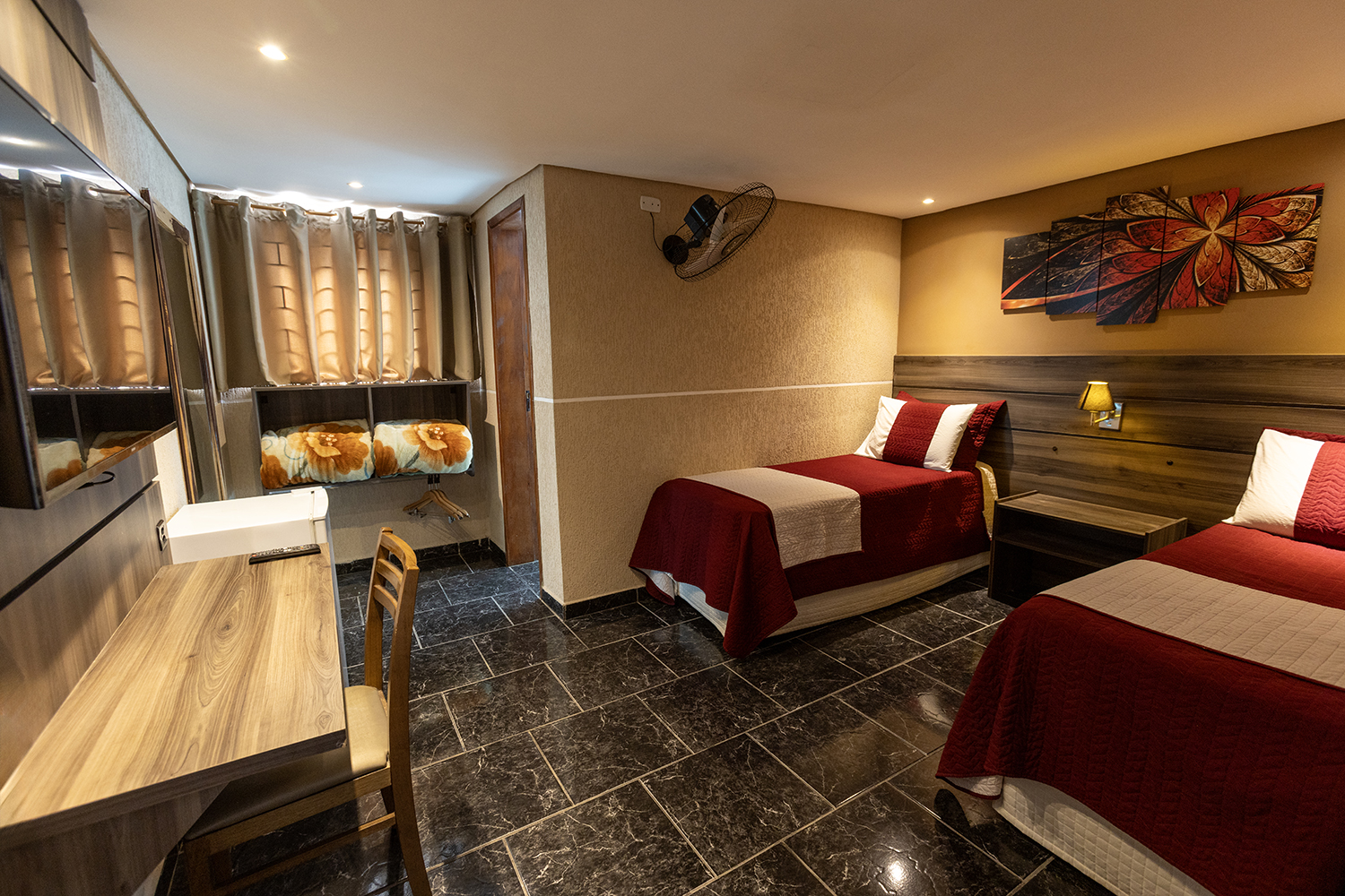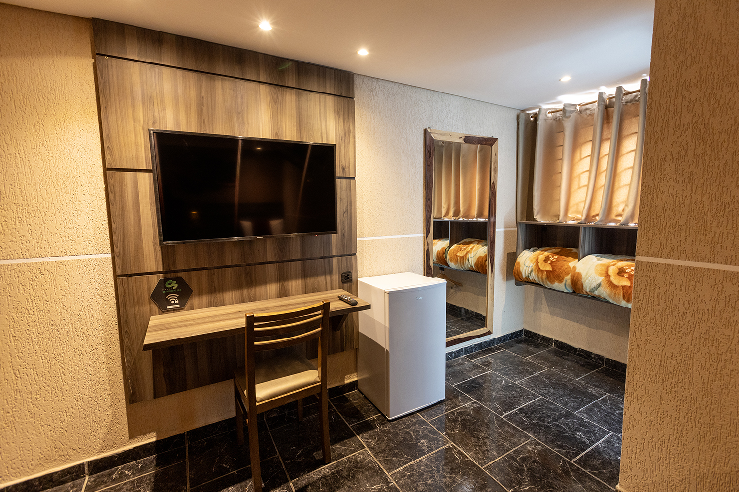 Oferece 2 camas de solteiro, TV Smart, ventilador e frigobar. Ideal para amigos ou colegas de trabalho.
