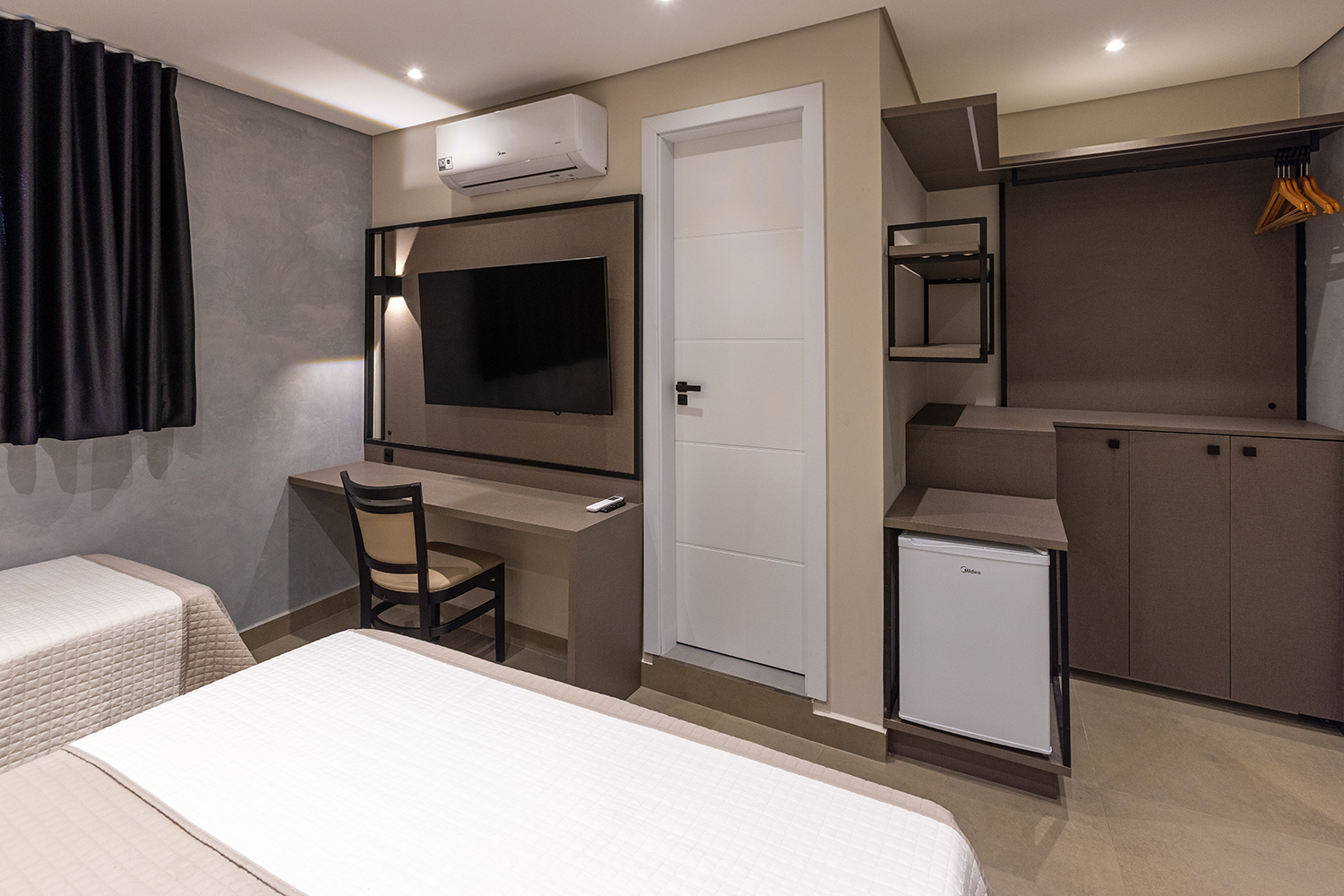 Apartamentos novos perfeito para famílias que desejam mais conforto. Com 1 cama de casal e 2 de solteiro, TV Smart 43”, ar-condicionado e frigobar, proporciona uma experiência mais completa e aconchegante.
