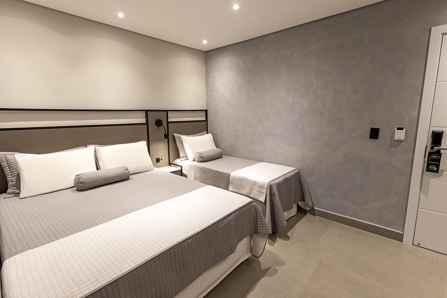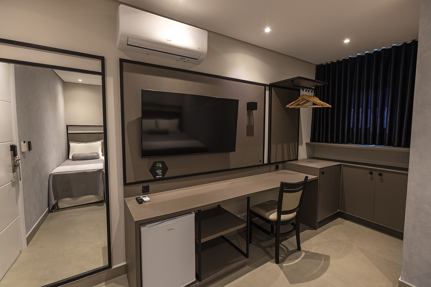 Apartamentos novos com mais conforto para sua estadia. Equipado com ar-condicionado, TV Smart 43”, frigobar, 1 cama de casal e 1 de solteiro.